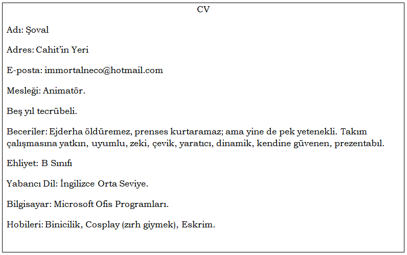 “Şoval’im CV ne bilmem; ama bak bizim kırtasiyeci Necati var, o bilir öyle işleri. Sen iki sokak ilerden sola dön, Neco Kırtasiye tabelası çıkacak karşına. Gir dükkana Cahit Abimin selamı var de, sana yardımcı olurlar.” dedi.